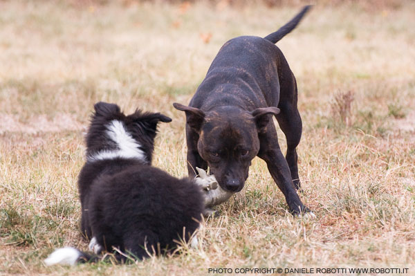 The Staffordshire Bull Terrier bitch challenges the Border Collie puppy to grab the toy.