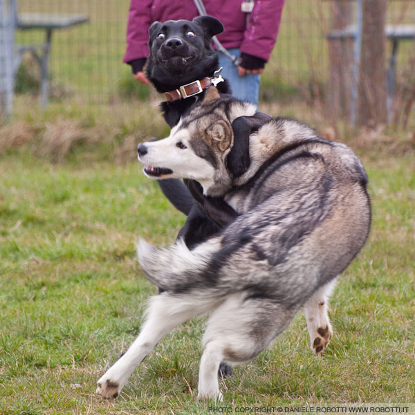 The young male black Labrador cross is playing with the Alaskan Malamute bitch in a very intense manner involving lots of physical contact.