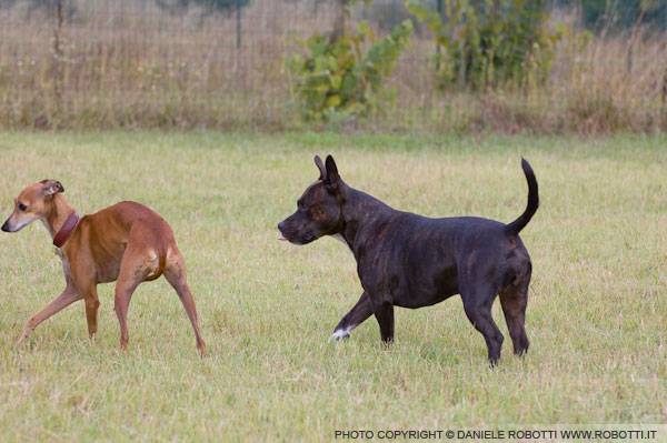 The Staffordshire Bull Terrier bitch approaches the small Italian Greyhound and displaces her.