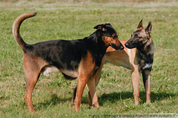 In this interaction between two males, the German Shepherd cross approaches the adolescent Belgian Malinois with a dominant approach and, after a brief olfactory exploration, turns toward the Malinois' head and, standing tall, stares.