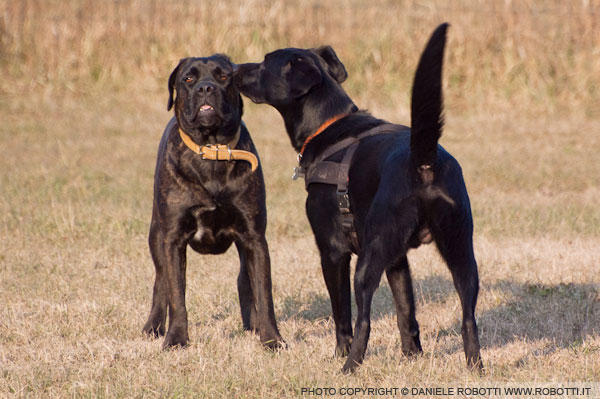 The male Labrador cross approaches the female Cane Corso and displays a nose nudge to her head.