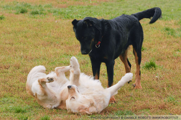 The female Golden Retriever rolls as the male Beauceron approaches, displaying courtship behaviours.