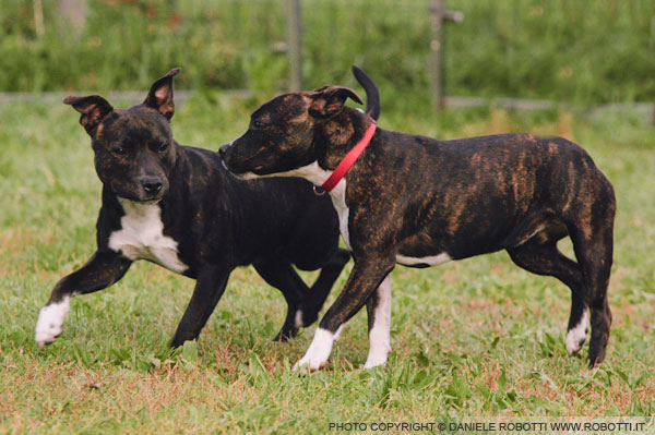 The Staffordshire Bull Terrier bitch with the red collar is stopped by her sister, who is about to cut across her path.