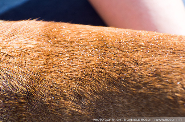 The dog's back is covered with dandruff; seen mostly in short-haired smooth-coated dogs.
