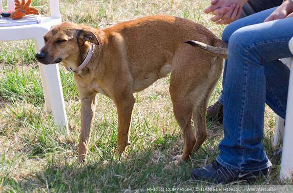 This young mixed breed female has approached a group of unfamiliar people. Her coat is covered in dandruff.