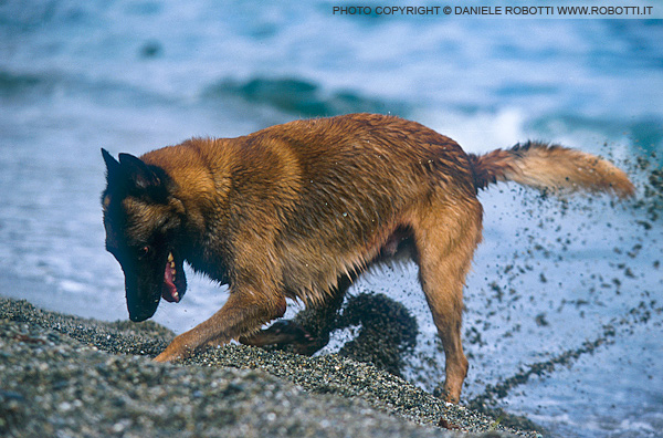 This Belgian Malinois is digging in the sand, completely absorbed in what he is doing.