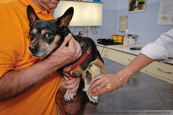 his owner during a veterinary examination. His ears are