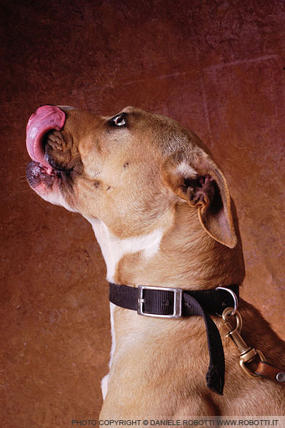 The dog's mouth is slightly open as it moves its tongue along its upper lip.
