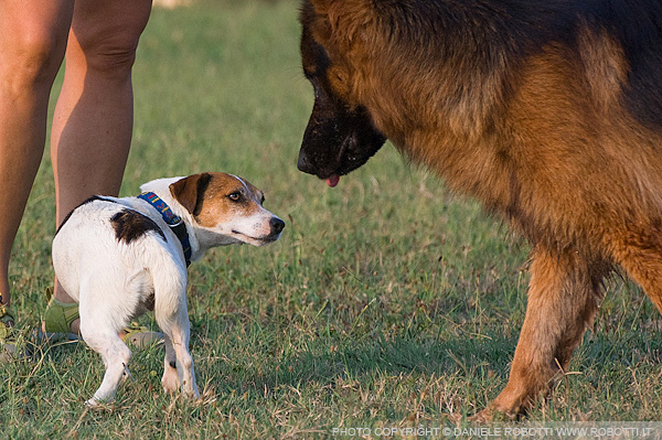 low posture as she encounters the male German Shepherd.