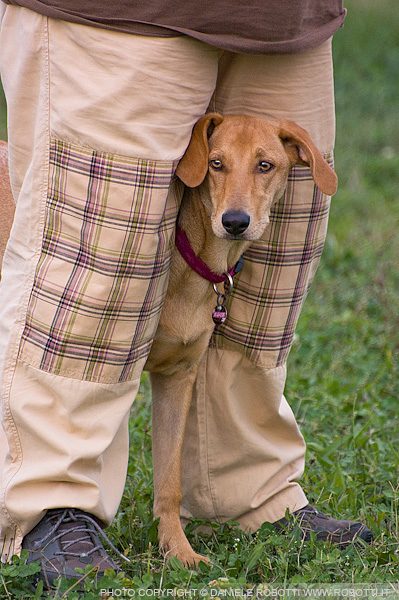 refuge behind her owner. Her head and tail are down as