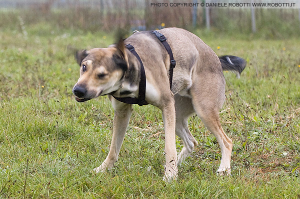ears. The Malamute shakes off;