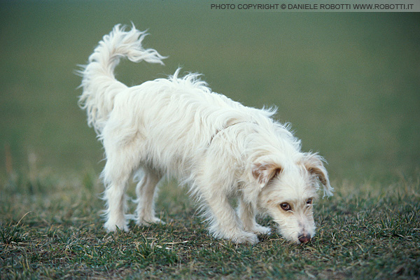 The Terrier mix is sniffing, tail