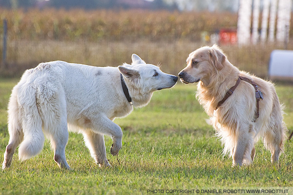 each other, circling. The Shepherd puppy moves away with