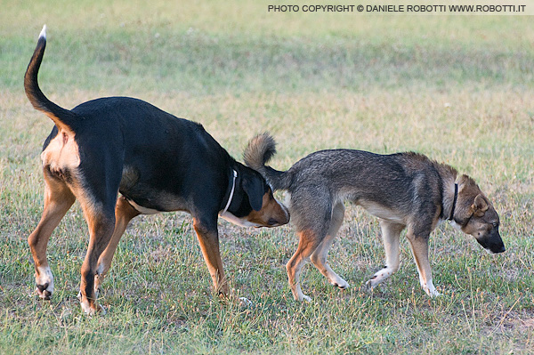 outside. The two dogs face off; the male wags his tail,