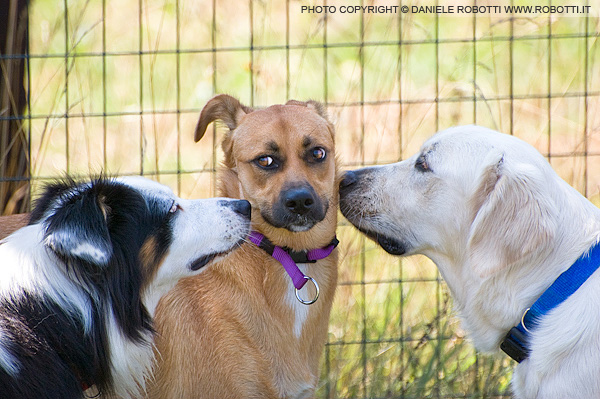the white of her eyes, while the other two dogs sniff